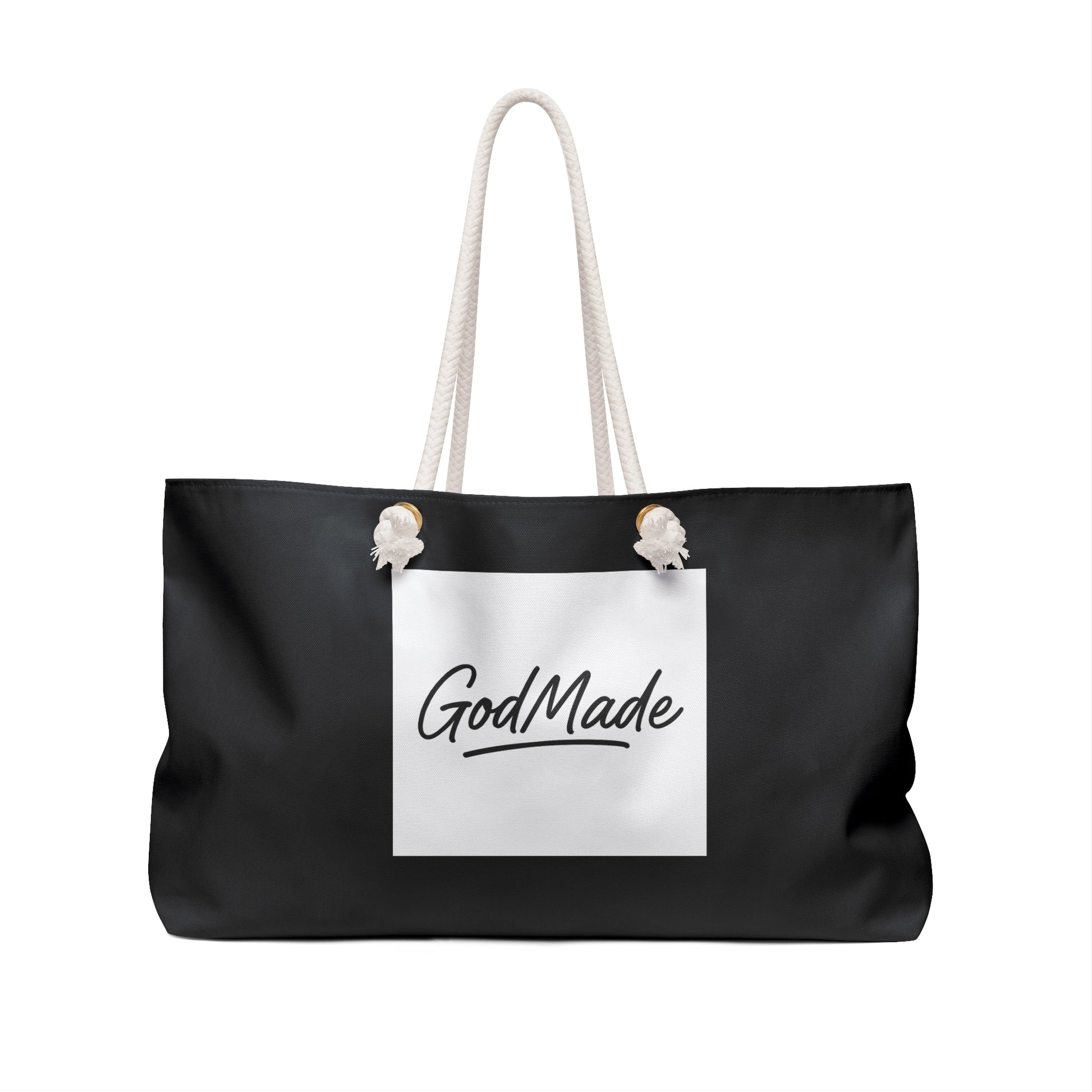 Embrace courage and boldly journey with the GodMade™ Scripture Weekender Bag. This essential travel tote features the empowering words of Isaiah 41:10, reminding you that you are never alone. With a durable 100% spun polyester material and soft cotton rope handles, this oversized tote is perfect for any trip, from beach days to overnight stays. The cream interior lining adds a touch of sophistication, while the GodMade™ signature logo on the back displays your faith proudly. Don't miss out on this must-have bag that will inspire and uplift you wherever you go. Move confidently, for you were made for adventure, not fear.